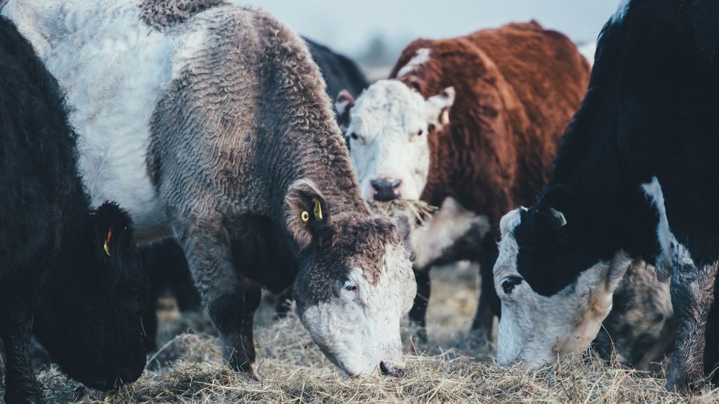 Beef cows eat roughages, grains, oil-seed, and co-products.